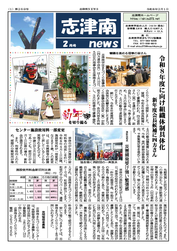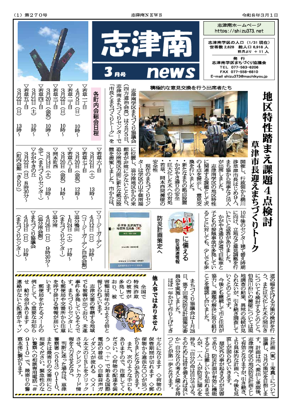 平成24年度から志津南地区まちづくり協議会が発足、平成26年度から小学校区を基本にまちづくり協議会が構成され、平成26年度から若い年齢層の追分南地区の3町内会、平成27年度から追分南町内会が加わり、13町内会で志津南学区まちづくり協議会となり、(世帯数 2,532、人口6,705、平均年齢 41、高齢化率 22.1%)現在に至っている。近隣には滋賀医大、立命館びわこキャンパス、県立美術館、図書館などがあり、高速 IC(草津田上)にも近く、かがやき通りには医療機関や食事処も多く、恵まれた生活環境です。