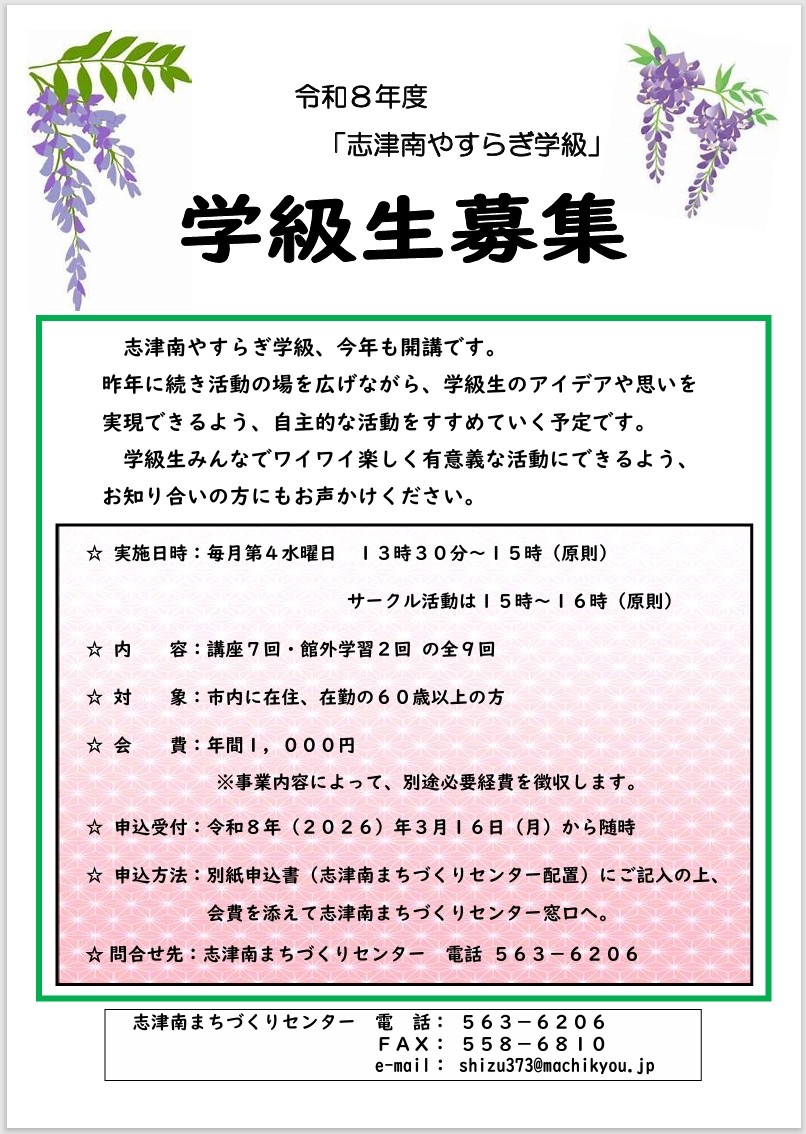 202603.13令和8年度「志津南やすらぎ学級」学級生募集from.やすらぎ学級 -