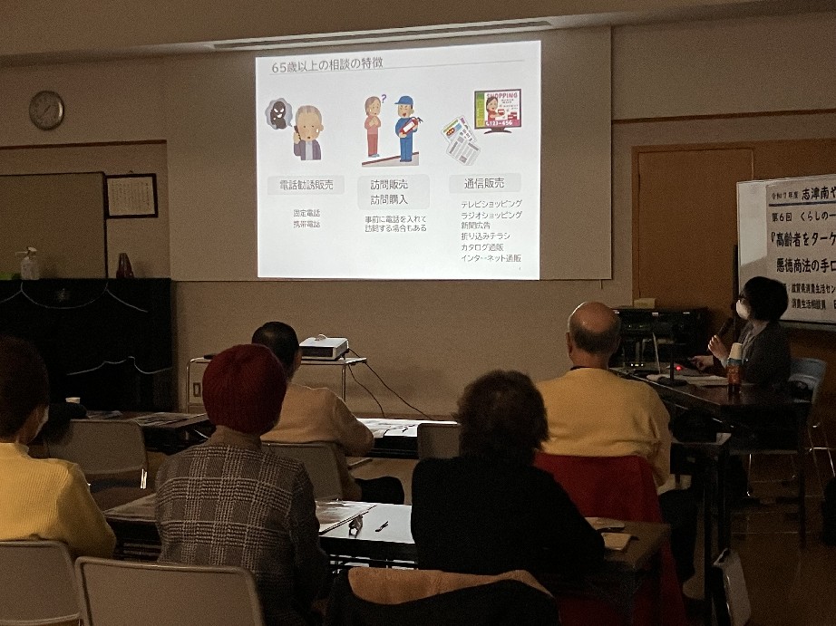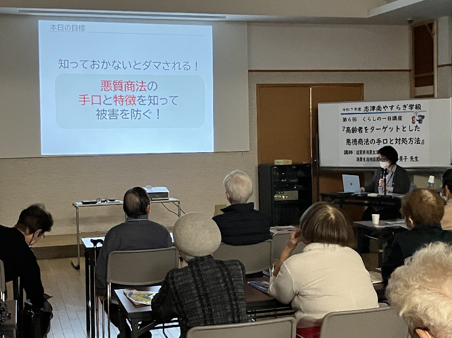 講師に滋賀県消費生活センターから消費生活相談員の先生に来ていただき、「高齢者をターゲットとした悪徳商法の手口と対処方法」と題しお話をしていただきました。
