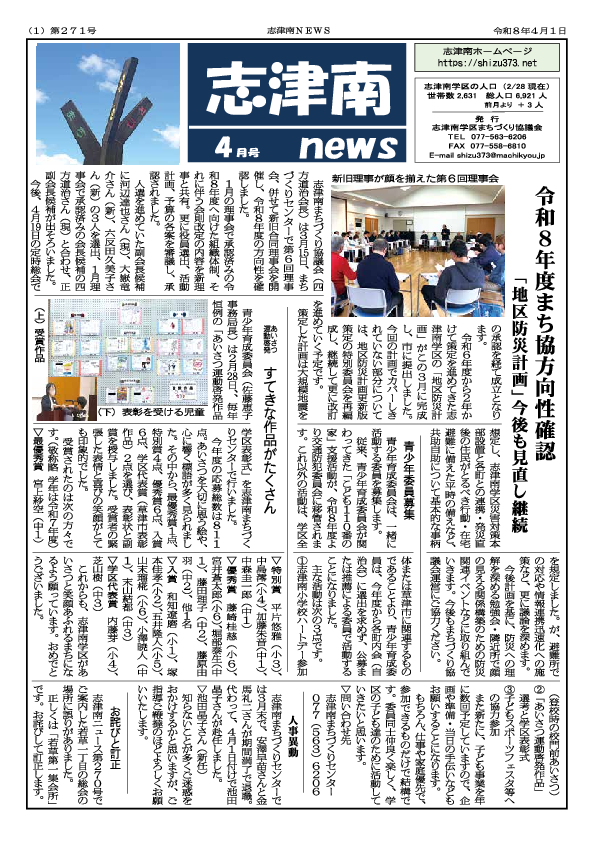 平成24年度から志津南地区まちづくり協議会が発足、平成26年度から小学校区を基本にまちづくり協議会が構成され、平成26年度から若い年齢層の追分南地区の3町内会、平成27年度から追分南町内会が加わり、13町内会で志津南学区まちづくり協議会となり、(世帯数 2,532、人口6,705、平均年齢 41、高齢化率 22.1%)現在に至っている。近隣には滋賀医大、立命館びわこキャンパス、県立美術館、図書館などがあり、高速 IC(草津田上)にも近く、かがやき通りには医療機関や食事処も多く、恵まれた生活環境です。
